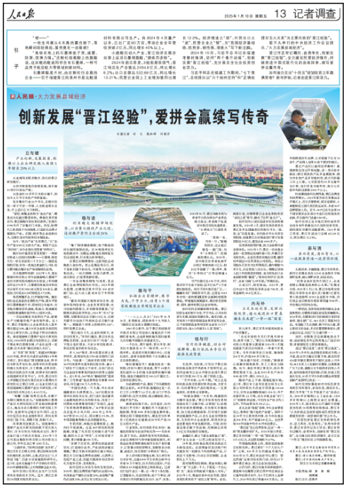 1月10日,记者查询拜访版刊发整版报道《立异成长“晋江经验”,爱拼会赢续写传奇》,聚焦福建晋江立异成长“晋江经验”,持续推进中国式现代化的县域摸索, 经济增速之“稳”、外贸出口之“进”、平易近营企业之“韧”,为“我国经济根本稳、劣势多、韧性强、潜能大”写下新注脚。
