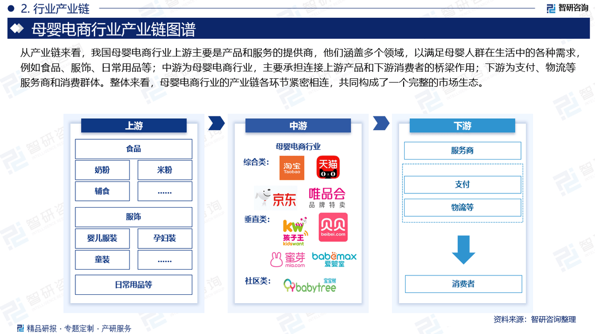 从财产链来看,我国母婴电商行业上逛次要是产物和办事的供给商,他们涵盖多个范畴,以满脚母婴人群正在糊口中的各类需求,例如食物、服饰、日常用品等;中逛为母婴电商行业,次要承担毗连上逛产物和下逛消费者的桥梁感化;下逛为领取、物流等办事商和消费群体。全体来看,母婴电商行业的财产链各环节慎密相连,配合形成了一个完整的市场生态。