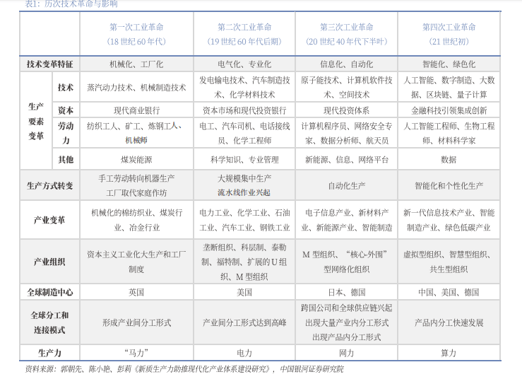 中国要正在百年变局中占领成长先机,就不克不及复制既有模式,必需依托新经济而不是旧动能。正在此布景下,“新质出产力”应运而生。2023年9月,习总正在新时代鞭策东北全面复兴座谈会上初次提出“新质出产力”这一开创性概念。2023年12月,地方经济工做会议强调!“以科技立异引领现代化财产系统扶植。要以科技立异鞭策财产立异,出格是以性手艺和前沿手艺催生新财产、新模式、新动能,成长新质出产力。”事实何为“新质出产力”?2024年1月,地方局特地就结实推进高质量成长进行第十一次集体进修,习总初次对新质出产力进行系统性阐释,“归纳综合地说,新质出产力是立异起从导感化,脱节保守经济增加体例、出产力成长径,具有高科技、高效能、高质量特征,合适新成长的先辈出产力质态。它由手艺性冲破、出产要素立异性设置装备摆设、财产深度转型升级而催生,以劳动者、劳动材料、劳动对象及其优化组合的跃升为根基内涵,以全要素出产率大幅提拔为焦点标记,特点是立异,环节正在质优,素质是先辈出产力。”从这个定义之中,我们能够分化出新质出产力的次要特征,驱动要素以及对经济的主要影响。概念,是指人们操纵劳动和出产材料创制物质财富和财富的能力,凡是用来权衡一个国度或地域正在必然期间内出产商品和办事的能力。正如上文所梳理,正在人类社会自工业以来履历的四次严沉的手艺变化中,出产力的内涵和外延也响应发生庞大变化,可简单归纳综合为马力一电力一网力一算力的跃升。而我们所强调的“新质”代表着分歧于保守模式,涵盖了包罗新手艺、新贸易模式、新兴财产、新范畴、新动力以及新正在内的多个维度,是正在分歧时间节点的动态概念。从驱动要素来看,新质出产力次要是由手艺的性冲破、出产要素立异性设置装备摆设、财产深度转型升级三大体素所催生。起首,手艺的性冲破代表着正在“新手艺”范畴实现严沉进展,强调可以或许完全改革现有手艺架构和使用方式的立异。例如,人工智能、量子计较、先辈材料、可再生能源和基因编纂等手艺就是这类立异的典型。其次,出产要素立异性设置装备摆设不只涉及对地盘、劳动力、本钱和手艺等保守出产要素的从头组合和使用,也包罗数字要素等新型出产要素的无效设置装备摆设,以顺应市场和手艺的演进,进而催生新的贸易模式和办事模式。最初,财产深度转型升级指的是对现有财产架构进行底子性的优化,提质保守财产,孕育新兴财产,以满脚新的市场需求、需乞降手艺前进的标的目的。新质出产力正在素质上是从导当下和将来成长的“出产力”。出产力是马克思从义理论的焦点从根基内涵来看,出产力三要素的跃升次要表现为劳动者跃升为高本质劳动者,包罗计谋人才、使用型人才等;劳动材料跃升为更高手艺含量的劳动材料,例如先辈制制手艺、工业互联网、工业软件等;劳动对象跃升为更广范畴的劳动对象,如计谋性新兴财产和将来财产等。