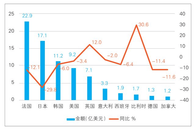 2024年上半年:进口总额83。6亿美元,美国进口占比进一步降至约12%,但降幅缩窄至3。4%,次要品类为高端护肤品。
